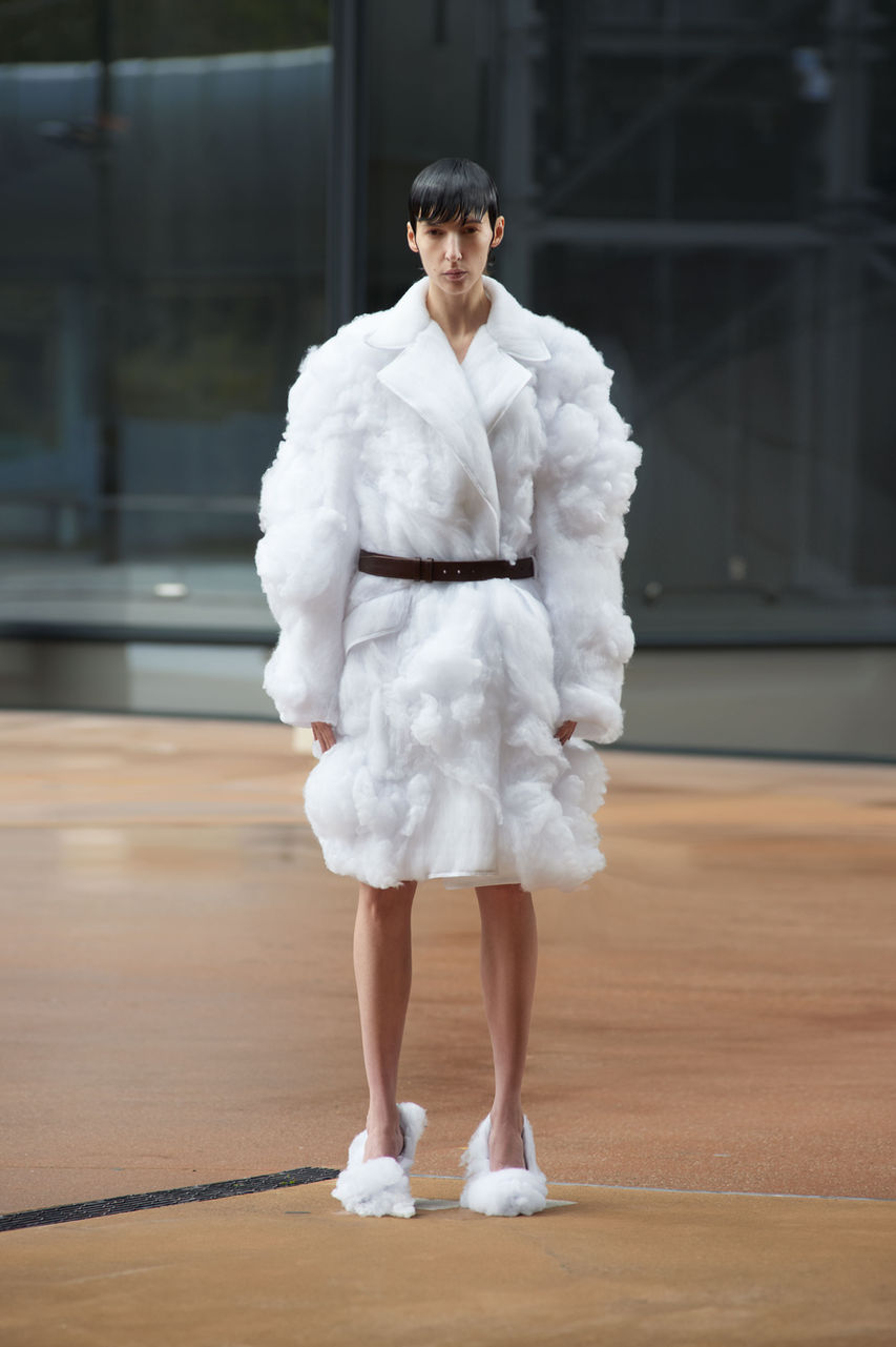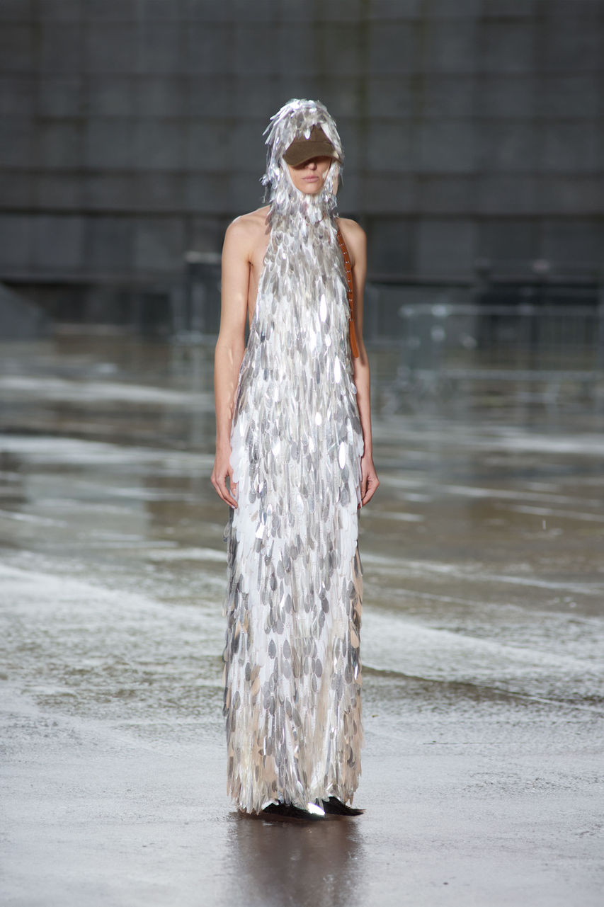 The SS25 collection employs zero-waste patterning methods and introduces garments and accessories crafted from upcycled studio waste. Highlights include the use of recycled plastic sheets and studio waste transformed into feather-like sequins and fabric remnants ingeniously repurposed as garment filling.
